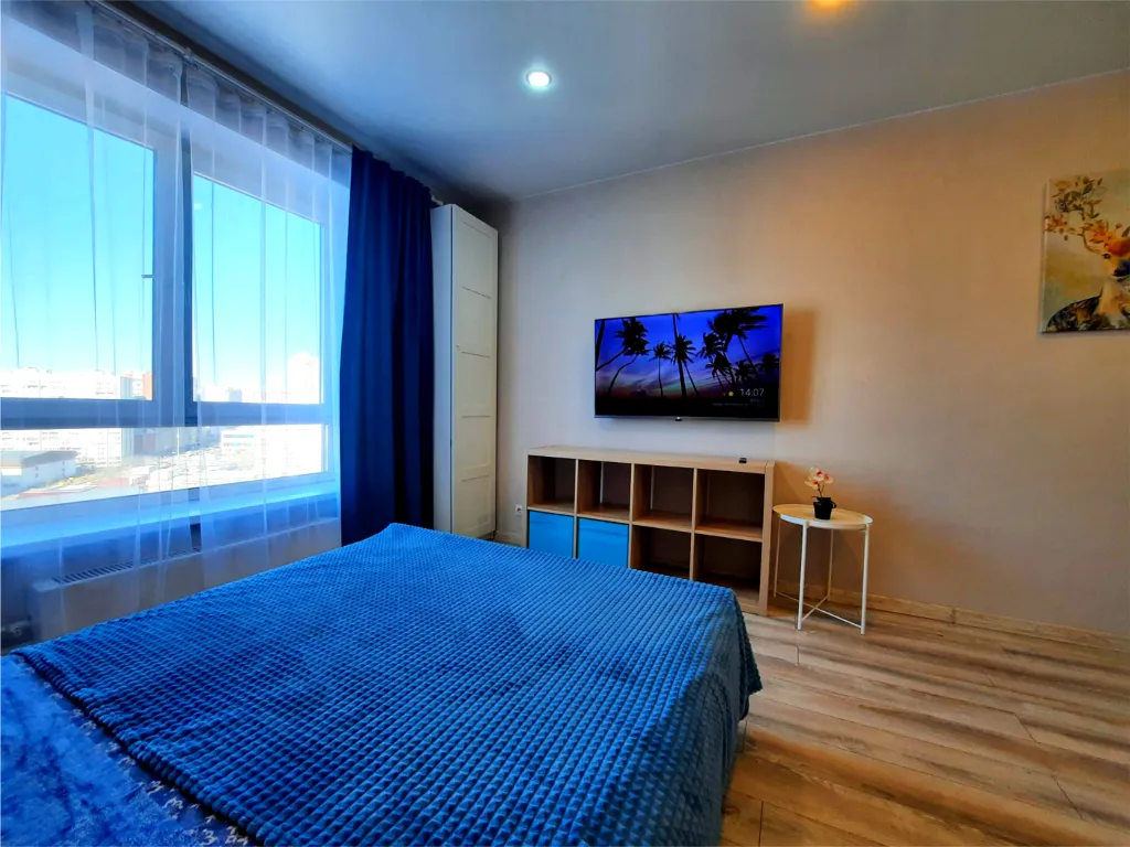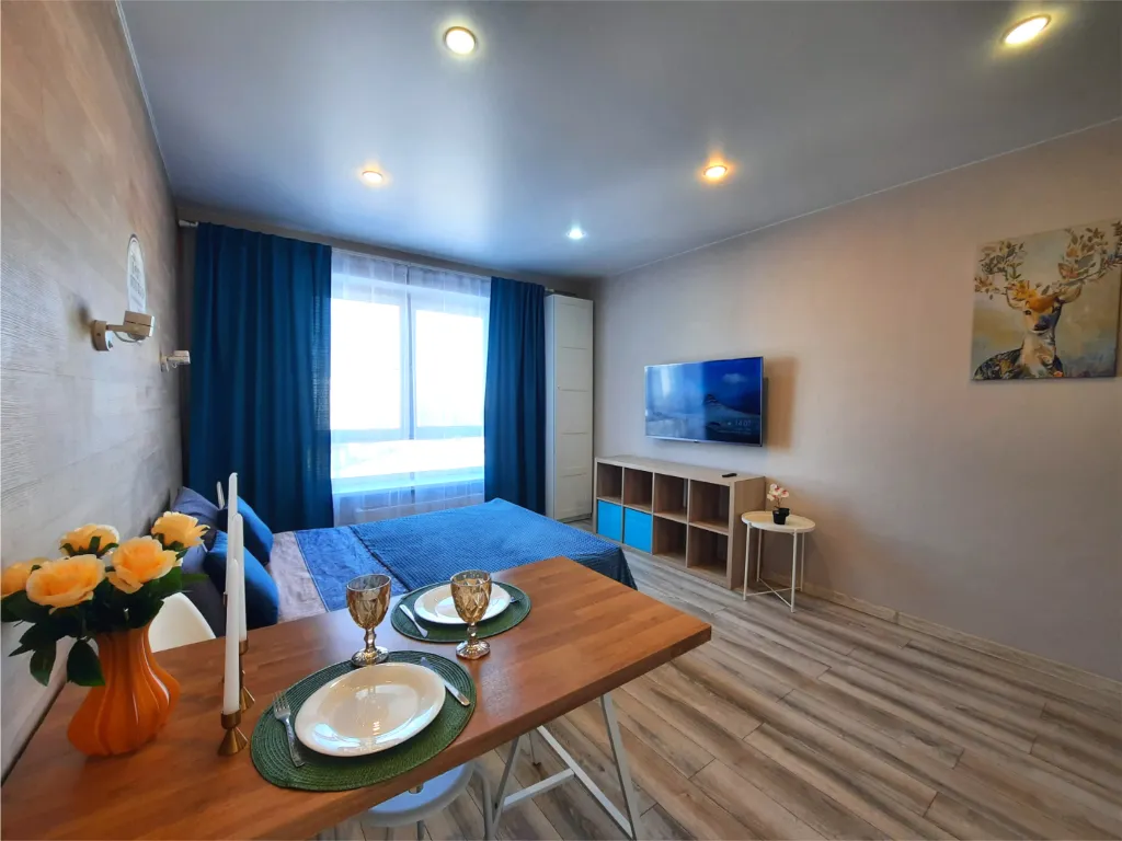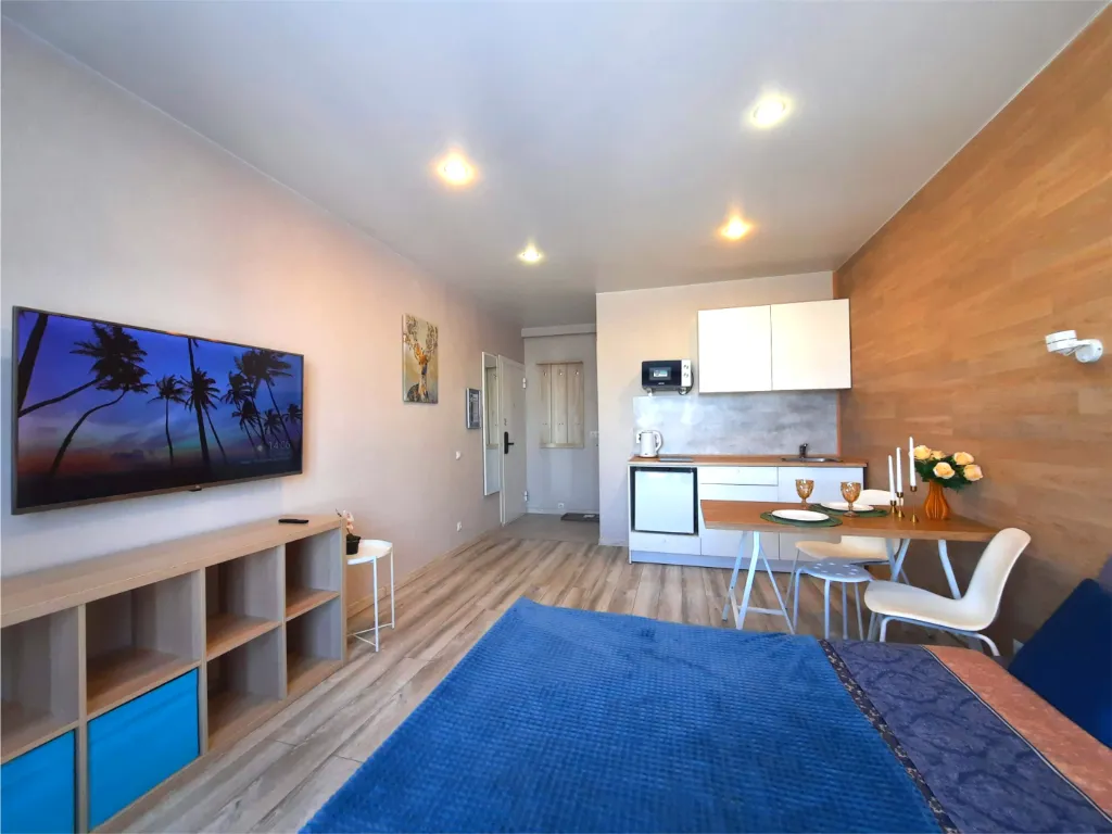 В студии установлена современная техника и созданы все условия для комфортного проживания: двуспальная кровать с комфортным матрасом, SMART TV с интернет-сервисами, высокоскоростной Wi-Fi, полностью оборудованная кухня, стиральная машина и сушилка для белья, набор посуды и приборов.
