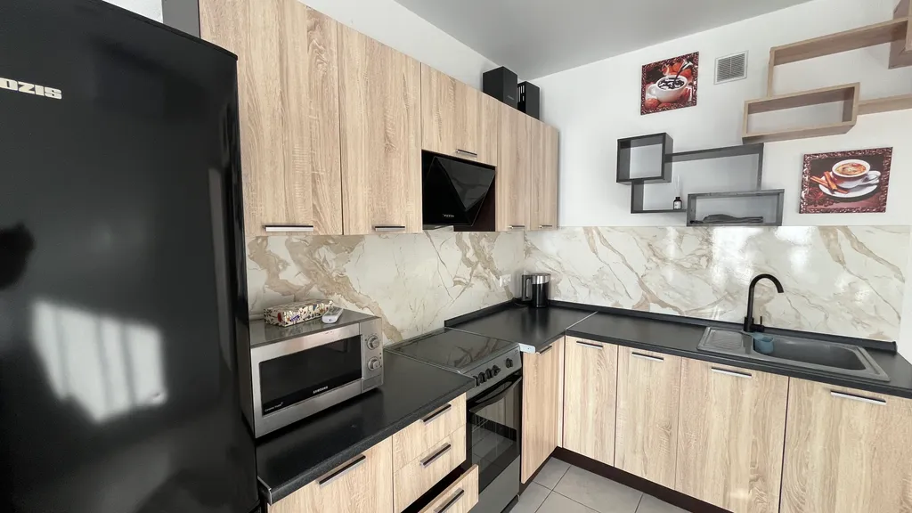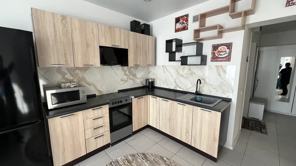 Кухонная зона: электрическая плитка, чайник, холодильник, духовка, микроволновка, посуда на 4 человек, кастрюли и сковорода