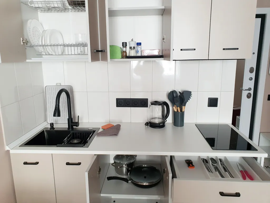 варочная панель, микроволновка, холодильник, чайник;