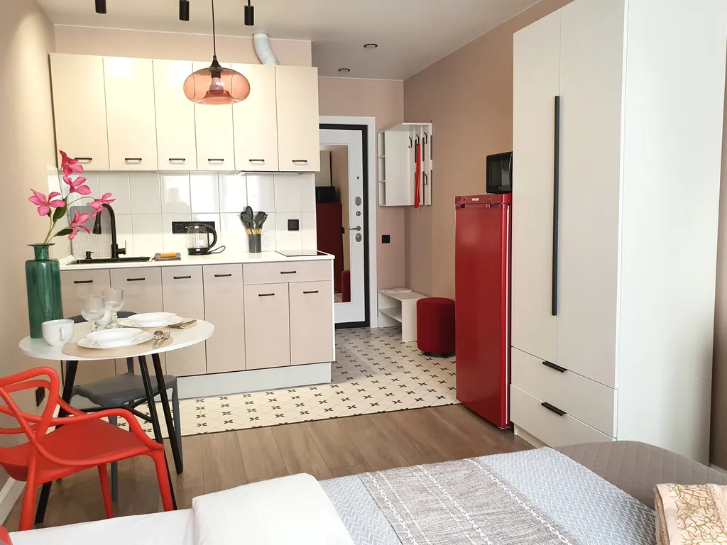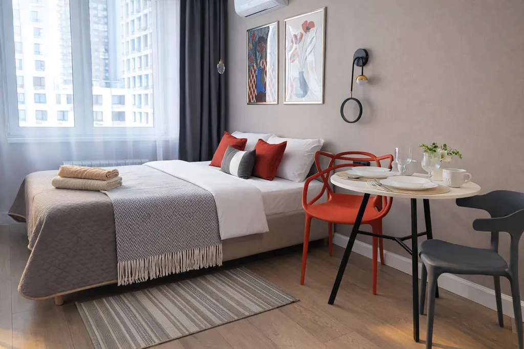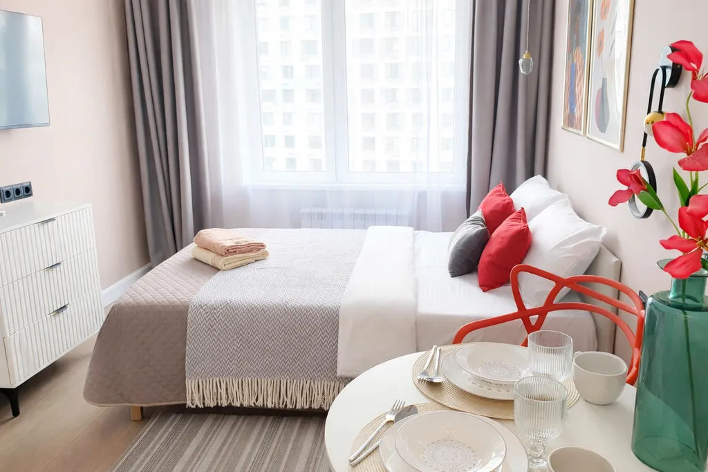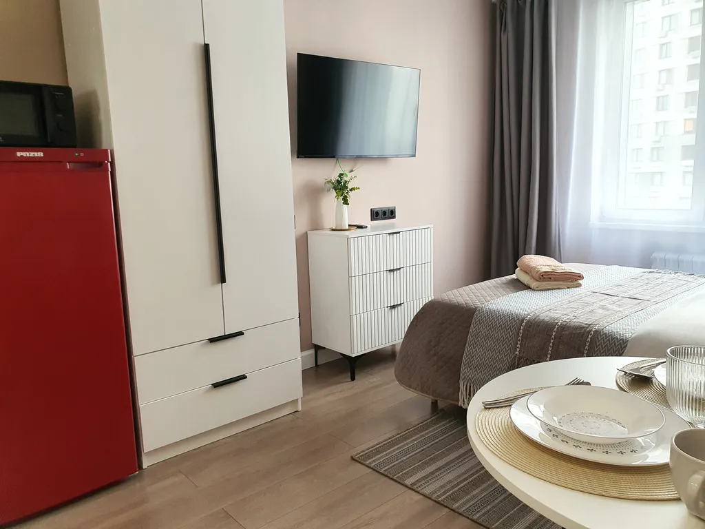 новая удобная двуспальная кровать; в квартире с комфортом могут разместиться до двух человек;